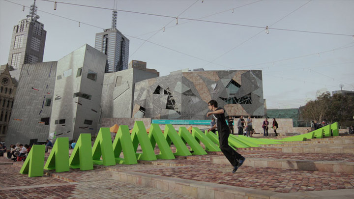 Twenty-one large triangles animated by Melbourne, throughout Federation Square.
